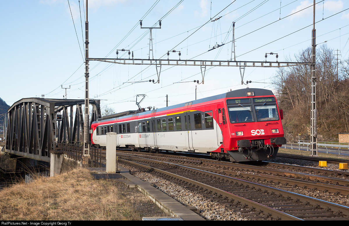 | Cab car ABt 172 and electric railcar RBDe 566 072 of the Südostbahn running as "S 27" from Siebnen-Wangen to Ziegelbrücke, just crossed the Linth river and entering Ziegelbrücke. The vehicles were built in 1982 for the Bodensee-Toggenburg-Bahn (BT). |