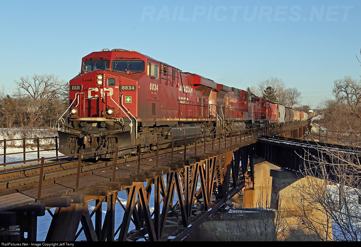 | Canadian Pacific 8834 rumbles over the Mississippi River at Camden, running on the old Soo Line and bound for Glenwood, Minn. |