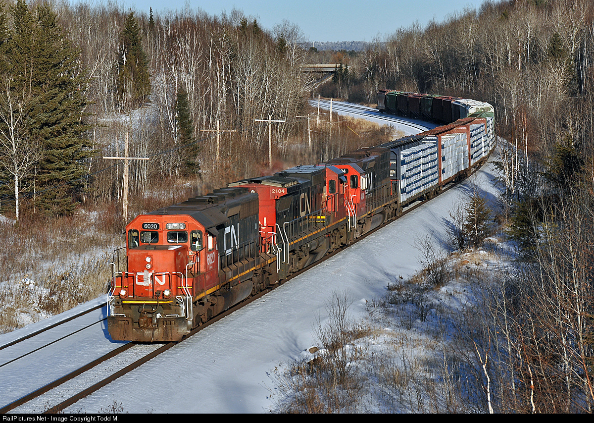 | It is possible to see a train on the CN Iron Range Sub traveling back and forth from Two Harbors that doesn't have ore cars involved. The Miscellaneous Road Freight is one of them. Heading back to Keenan Yard from Two Harbors with loaded centerbeams of siding from the LP plant and empty bentonite cars from Northshore Mining is a neat consist of an SD40u and SD40-3 sandwiching a Dash 8. |