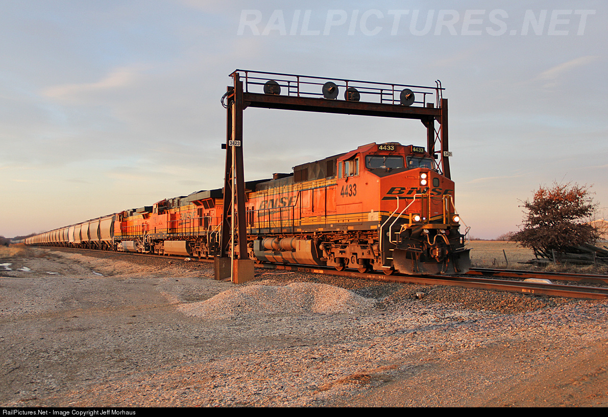 | BNSF 4433, BNSF 7786 and BNSF 4086 leads a loaded sand train east towards Bucklin, Missouri under one of the three remaining operating signal bridges left in Missouri that I know of on BNSF's former ATSF Marceline Sub. |