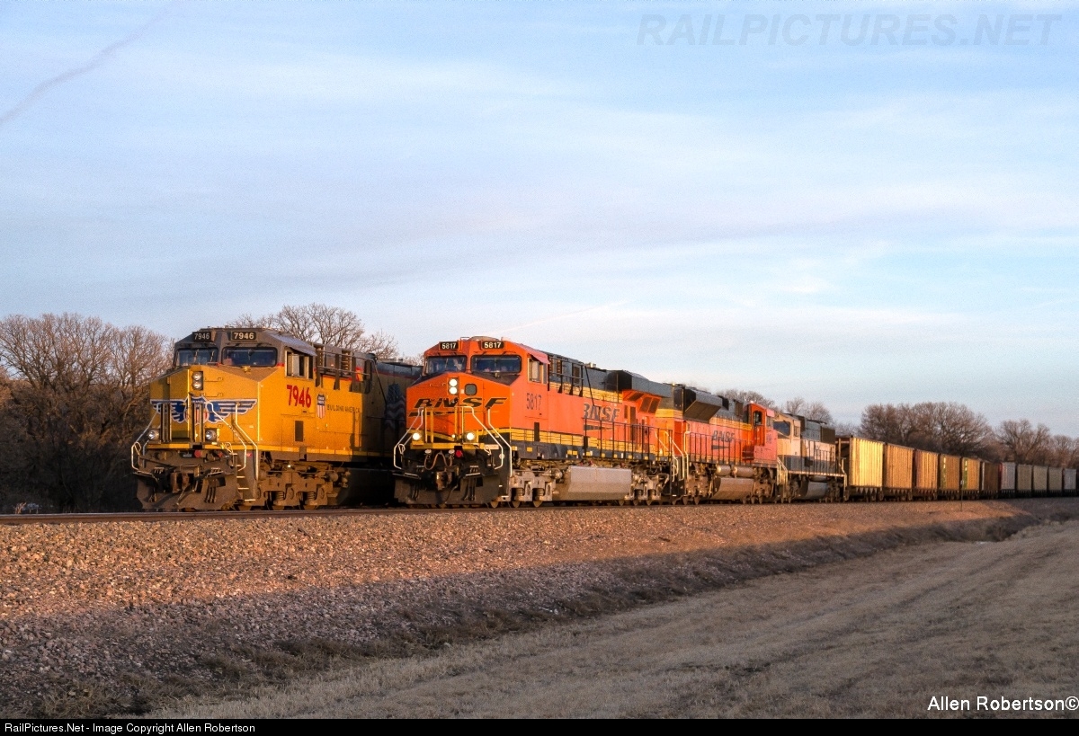 | BNSF 5817, 9096, & 9602 lead westbound empties past UP 7946 which is the dpu on an eastbound BNSF coal train. |