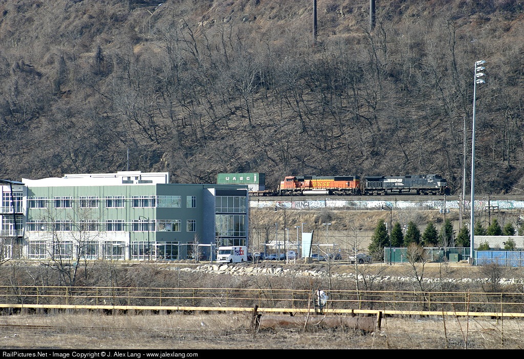 NS 227 as seen from across the Monongahela River with 9337 and a BNSF SD70MAC.