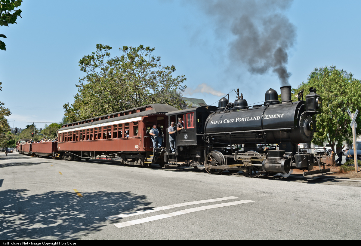 The 0-4-0T Santa Cruz Portland Cement No. 2 (aka "The Chiggen"), built by H. K. Porter in 1909, began life at the cement plant in Davenport (11 miles north of Santa Cruz) and served there until 1924. The No. 2 made a special guest appearance on the Santa Cruz and Monterey Bay Railway during the weekend of July 11-13, 2014. Seen here with cars from the Santa Cruz Big Trees and Pacific Railway in tow, the Chiggen approaches Depot Park at the south end of Chestnut St. on its way to Wilder Ranch located on the Davenport Branch Line.