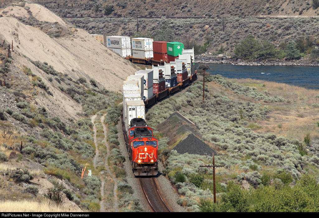 111 for 111 Canadian National train No. 111 approaches Tunnel 51.5 west of Ashcroft, British Columbia. Ironically, the high temperature of the day while photographing this train in this part of Thompson River Canyon ended up being a scorching 111°F! Above the intermodal on the other side of the river is Canadian Pacific’s main line.