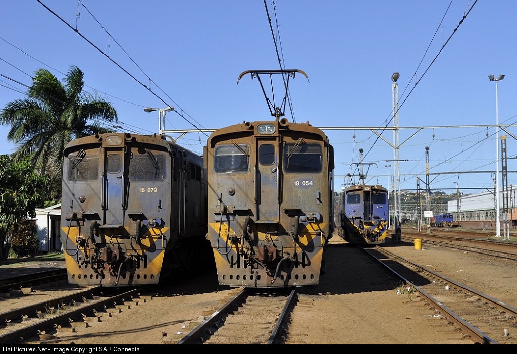 | The mainstay of the very busy Natal Main Line, or the Natal Corridor as it is also known, in terms of motive power, the Class 18E. 18-079 / 18-054 stand ready at Umbilo Electric Locomotive Depot awaiting their next duties. |