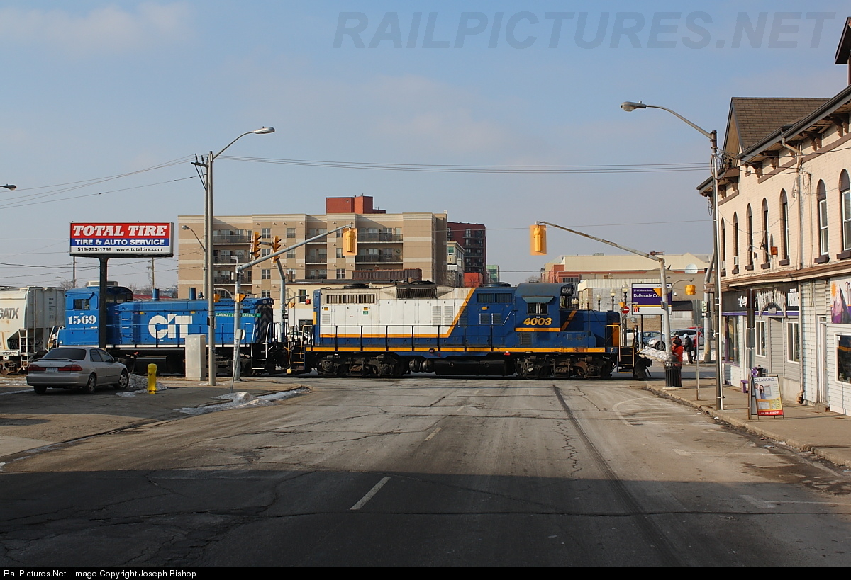 | SOR 496 is seen crossing Colborne Street in downtown Brantford with RLK 4003, CEFX 1569 and 5 hoppers trailing. The Ingenia Polymer plant bought the line from CN in 2014 after CN announced its intentions to abandon the line. The Southern Ontario Railway has been contracted to service the line. This was their third run down the Burford Spur. |