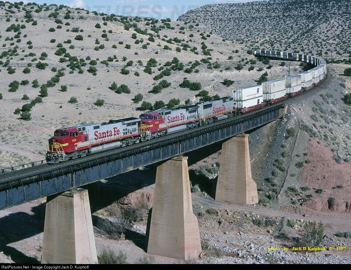 | AT&SF #611, leads a west bound on bridge 2,in Abo Canyon, NM. 4/14/1997 |