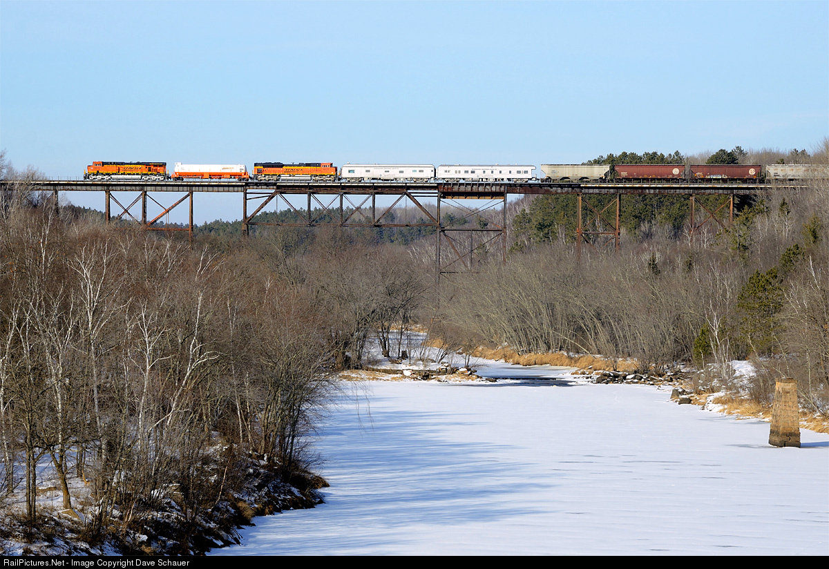 | BNSF's LNG test set rolls southbound train Superior-Northtown across the frozen Kettle River. BNSF 5815, BNSF 9131, tender BNSF 933501 along with test cars 82 and 83 make up the set. |