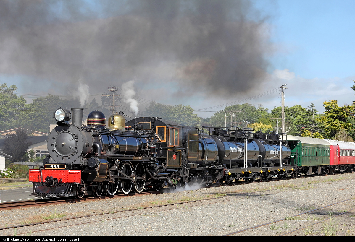 | Ab 663 was retired by NZ Railways in 1969 and was eventually stripped of parts for the Kingston Flyer Ab locomotives. It was purchased by Mainline Steam in 1983 and restored, being reunited with a tender (from 811.) 663 returned to mainline in 1997. Here it is captured at East Town complete with red coaches from Feilding DSR for excursion trains around Wanganui. |