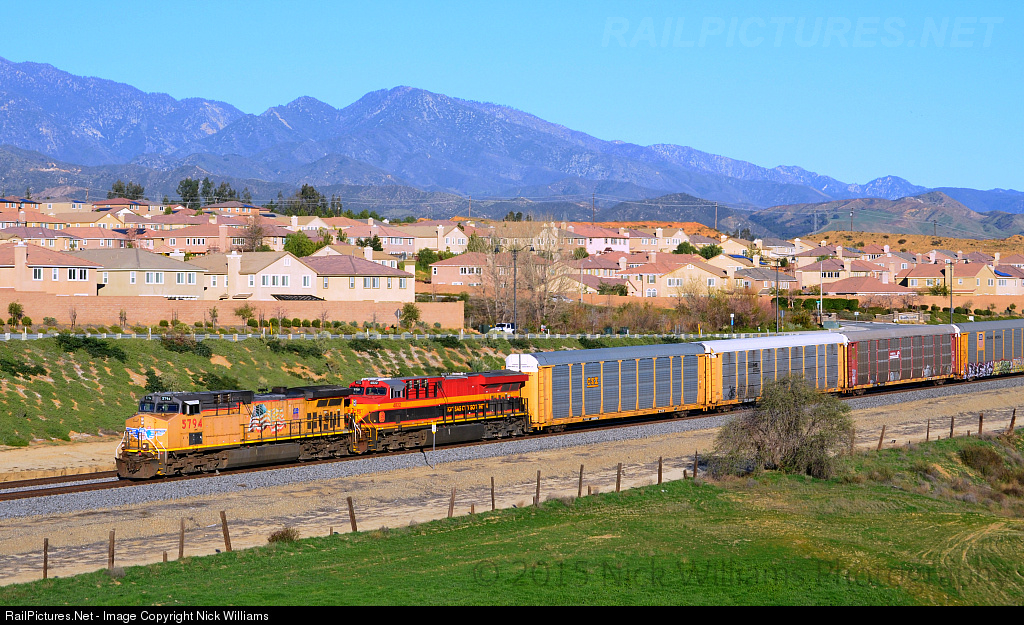 | Wouldn't you love to live in that little neighborhood? A UP AC4400 and KCS GEVO ease an Autoracks train into San Timoteo Canyon, passing a small Beaumont neighborhood. |
