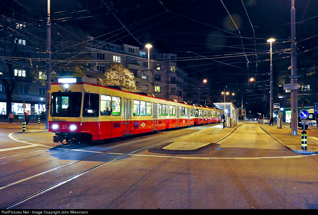 | Forchbahn (Forch railway) 27 four car set descends from Hegibach towards the downtown of Zurich. Between Stadelhofen and Rehalp, the Forchbahn trains use the tracks of the tram system, owned by the Verkehrsbetriebe Zürich. |