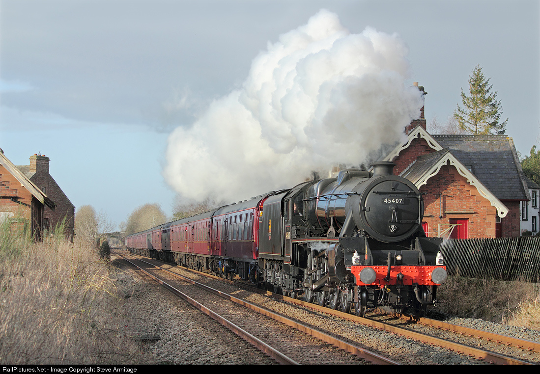 | Much against a pessimistic forecast, the weather today in the Eden Valley was glorious. The sympathetically restored former station at Long Marton plays its part in what continues to make the Settle and Carlisle route so special to travelers and railway enthusiasts alike. 45407 is the real star of the show in this image though. If you think she looks good, you should have HEARD her! |