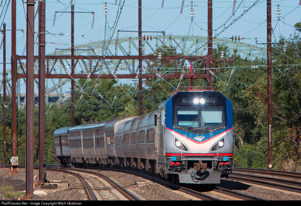 The "Delaware River-Turnpike Toll Bridge" (Built in 1956) serves as backdrop for Amtrak Cities Sprinter #612 as the train swings around a curve in Bristol, PA. The bridge is unique to the area as the two nearest large bridges over the Delaware; the Burlington Bristol Bridge and the Tacony Palmyra Bridge were built much earlier and much lower, each of those requiring a drawbridge. According to Wiki, a local AAA chapter petitioned to have bridge named after William Penn. A second identical bridge is expected to be built in the near future to handle increased traffic. Perhaps both will be given more inspired names, though hopefully not something commercial as seems the norm today with sports venues.