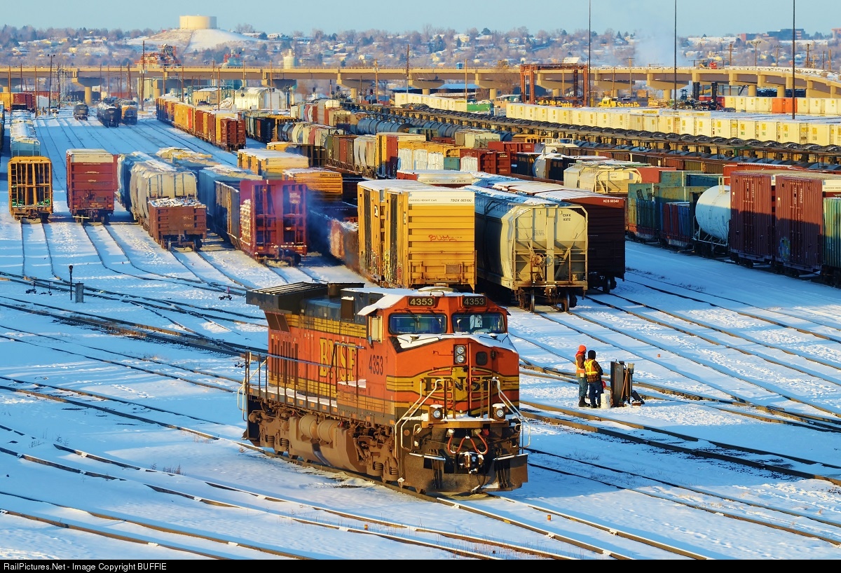 | It is well below freezing as the sun begins to dip behind the mountains. Sitting all alone in the Union Pacific's North Yard is BNSF 4353 (Dash-9), waiting for a UP partner and a string of freight cars. |
