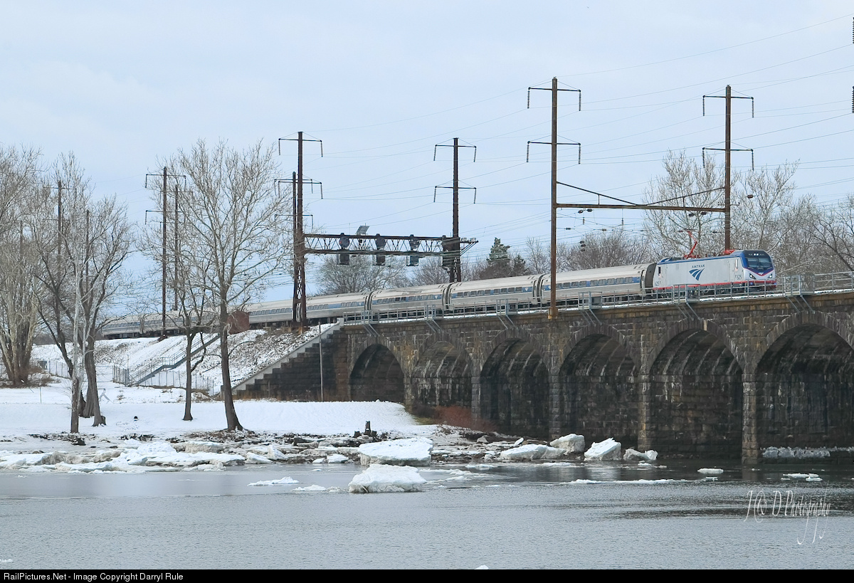 | After recently being released for revenue service, ACS-64 #625 leads Northbound Norrtheast Regional train 152 out onto the Delaware River Bridge from Morrisville, PA to Trenton, NJ. Just a few ice chunks remain as the temperatures the previous week rose enough to release the ice jam from this location. |