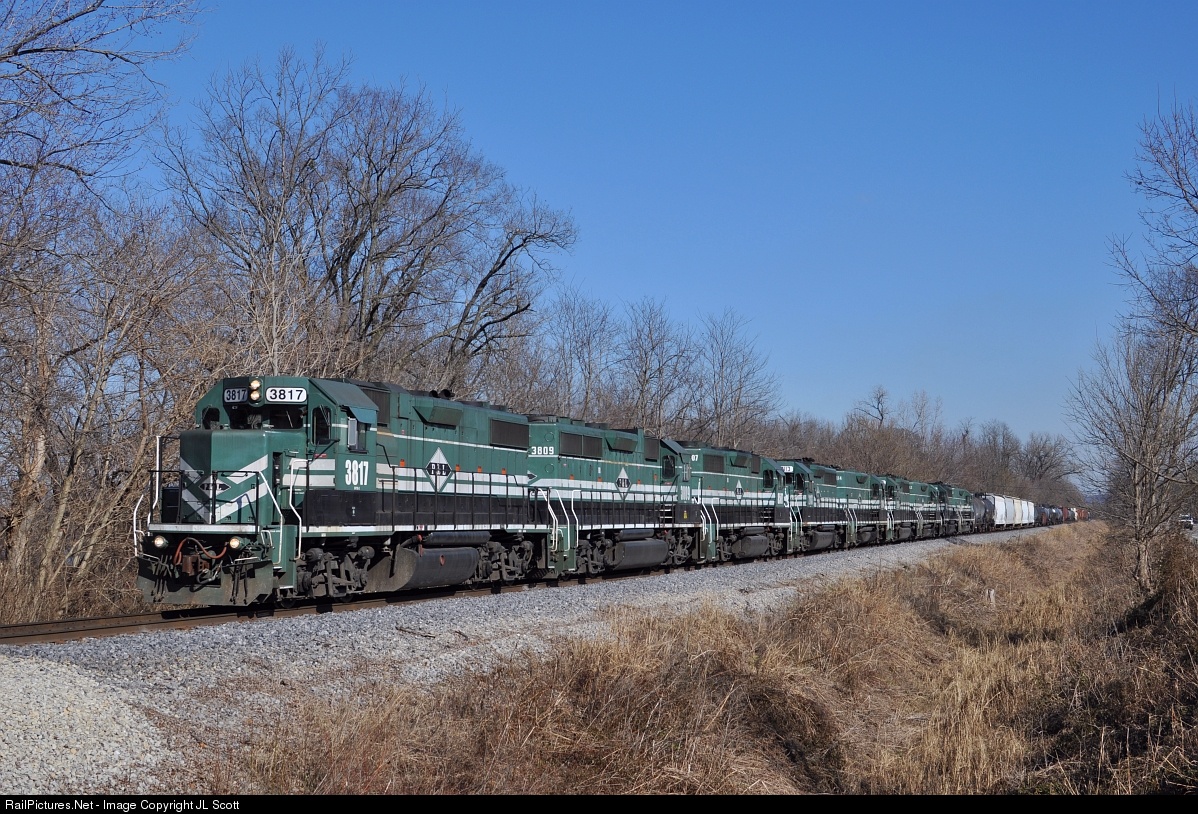 PAL CC2 heads south through West Point behind nine 4-axles, all green! The massive consist includes: 3817, 3809 (GP38-2), 8507 (GP39-2), 2113/2114, 2119/2112, 2121/2100 (GP40-3/road-slug). The mother/slugs are in route to Paducah for servicing after making several turns between McHenry and Louisville on coal trains.
