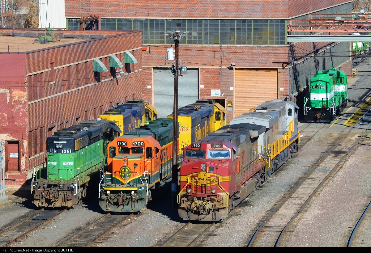 You can always count on finding a colorful group of engines waiting for servicing at the BNSF engine facility in Denver.