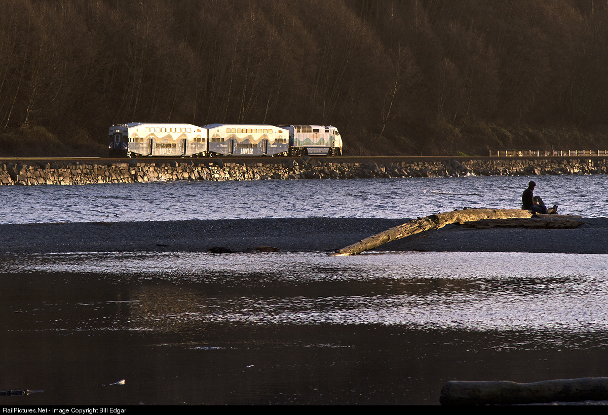 Sound Transit train 1700, the first afternoon rush hour commuter train, rolls along Puget Sound at Carkeek Park in Seattle at sunset. A lone person on the beach does not seem to have much interest in its passing, and the two car train tells of the lack of ridership on this route. The north route to Everett has stops in Edmonds, Mukiteo, and Everett.