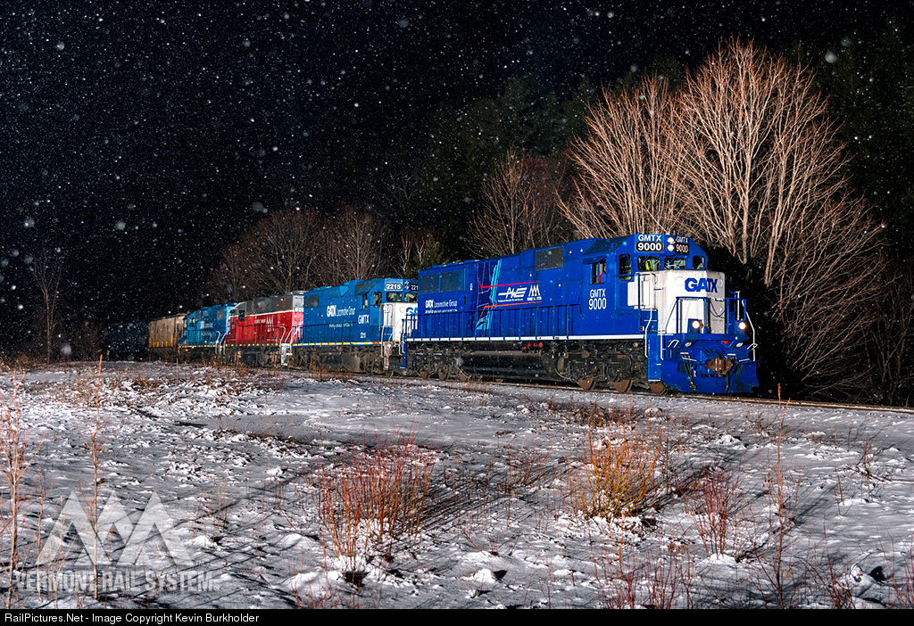 The first half of an 80-car ethanol train operating on the Green Mountain Railroad is seen with with GMTX SD60 9000 leading GMTX GP38-2 2215, VTR GP38-3 207 and GMTX GP38-2 2208 heading upgrade through Shrewsbury, Vermont in the pre-dawn hours of January 25. The GMTX SD60, jointly leased by Providence & Worcester and the Vermont Rail System for use is serving the Green Mountain Gateway routing for this particular train, with Canadian Pacific Railway handing the train off to the VRS at Whitehall, NY and the P&W delivering to Motiva in Providence, RI.