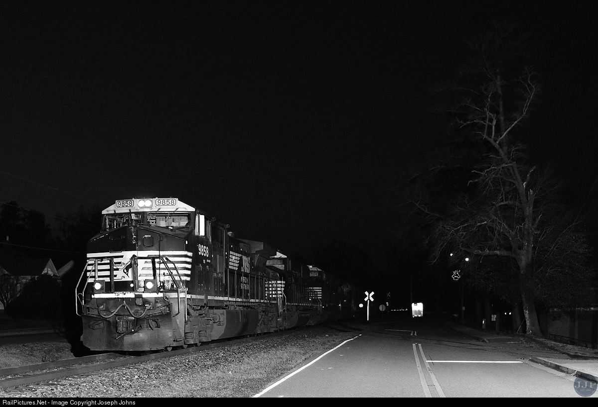 | NS E13 North passes R 178 in Graniteville 10 years later just before sunrise. On Jaunary 6, 2005 train 192 northbound was diverted from the mainline into a side track head on into a tied down local p22. The accident spilled chlorine and a few other chemicals, killing 192's engineer and 8 others. Clean up took weeks and environmental effects still linger today. Not only were some did the health of the population suffer, but the local textile mill shut down. Today mew jobs are coming in because Reclaim took over the site of the old mill. NS 192 now runs as E13 on the R line is essentially this is the same train that was involved in the accident 10 years ago. |