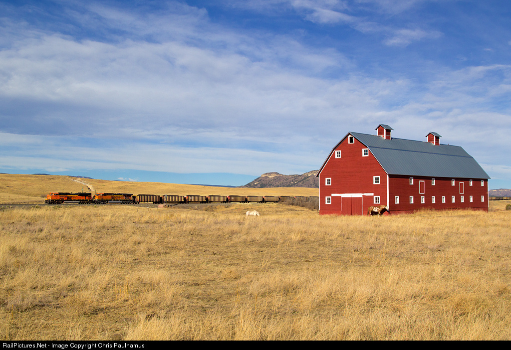 BNSF 9235 leads another string of coal up the grade through Greenland while a couple of horses chill by the big red barn.