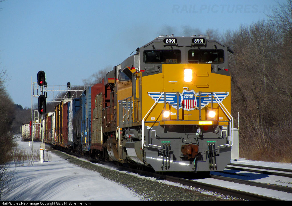 | A very factory fresh(note the spotless plow) UP SD70AH rumbles into the Town of Voorheesville NY on a limited approach behind a Q384 ahead on a busy crisp morning on the CSXT Selkirk Sub. The defeated super storm Juno has blown out of town leaving barely a few inches behind in the Capital Region with frigid clear skies in it's wake and plenty of backed up traffic. The UP 8991 is the latest new model from EMD to the UP roster. |