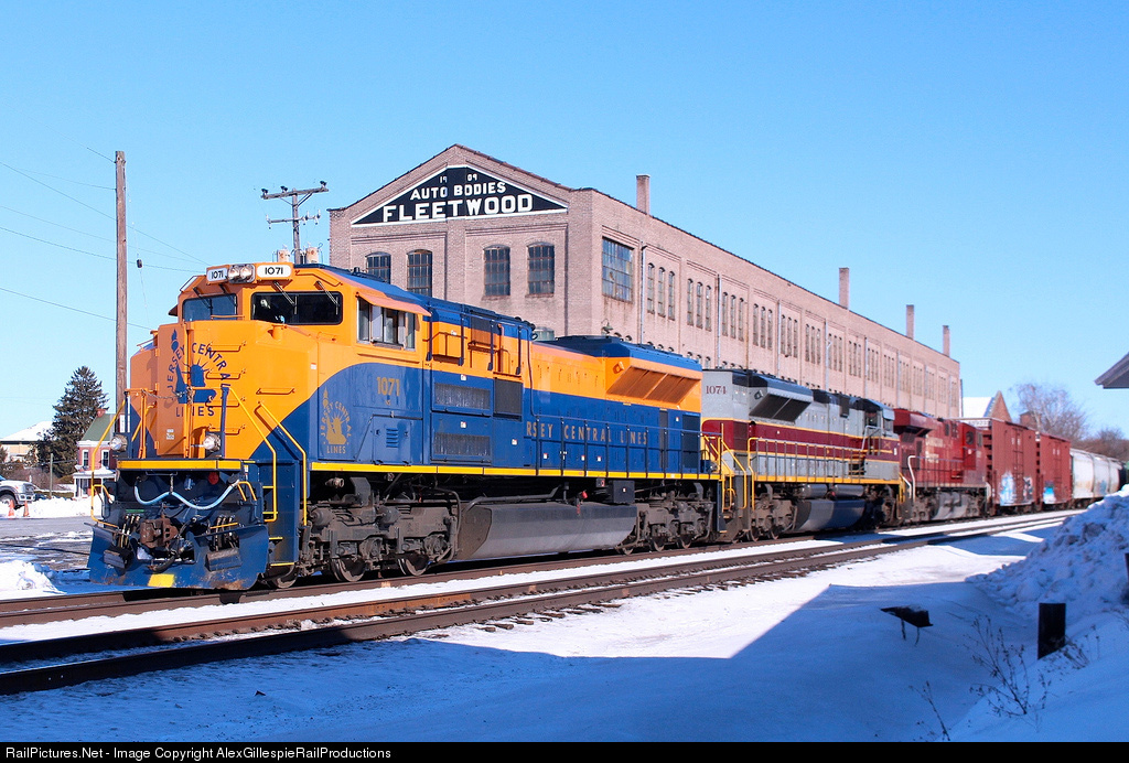 | The Central of New Jersey Heritage Unit 1071,Leads the Delaware Lackawanna and Western Heritage Unit 1074 and a CP ES44AC on H-68,the Daily Allentown PA to Reading PA and Return Local on a Cold but Beautiful January Day at Fleetwood PA past the Old Fleetwood Cadillac Plant. |