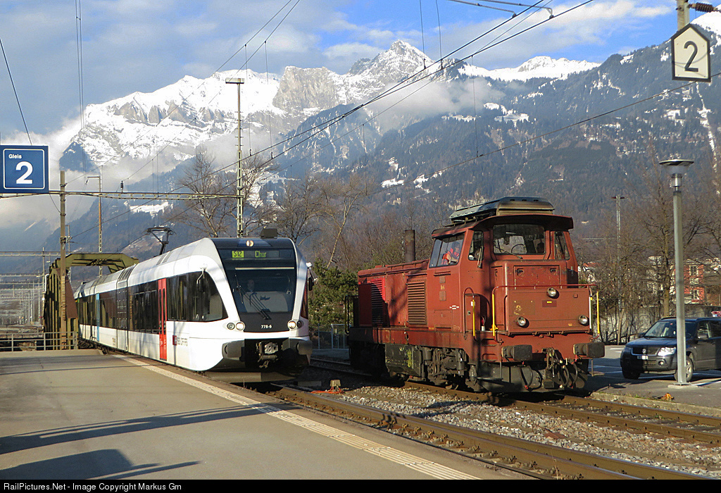 | Left localtrain line S12 from Sargans to Chur arrives at Landquart in the afternoon sun. Right shunting diesel Bm 4/4 from the SBB waits for work |