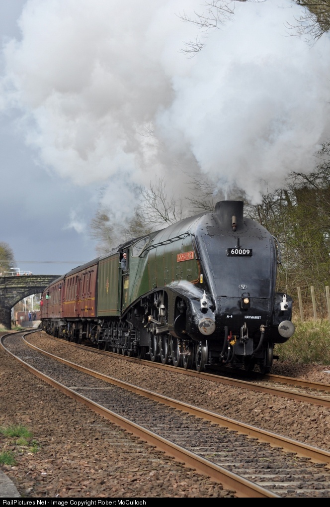 | Preserved A4 Pacific 60009 UNION OF SOUTH AFRICA climbs towards Dalgety summit with 1Z29 09:50 Linlithgow to Dalmeny via Kirkcaldy, SRPS Railtours Forth Circle special. |