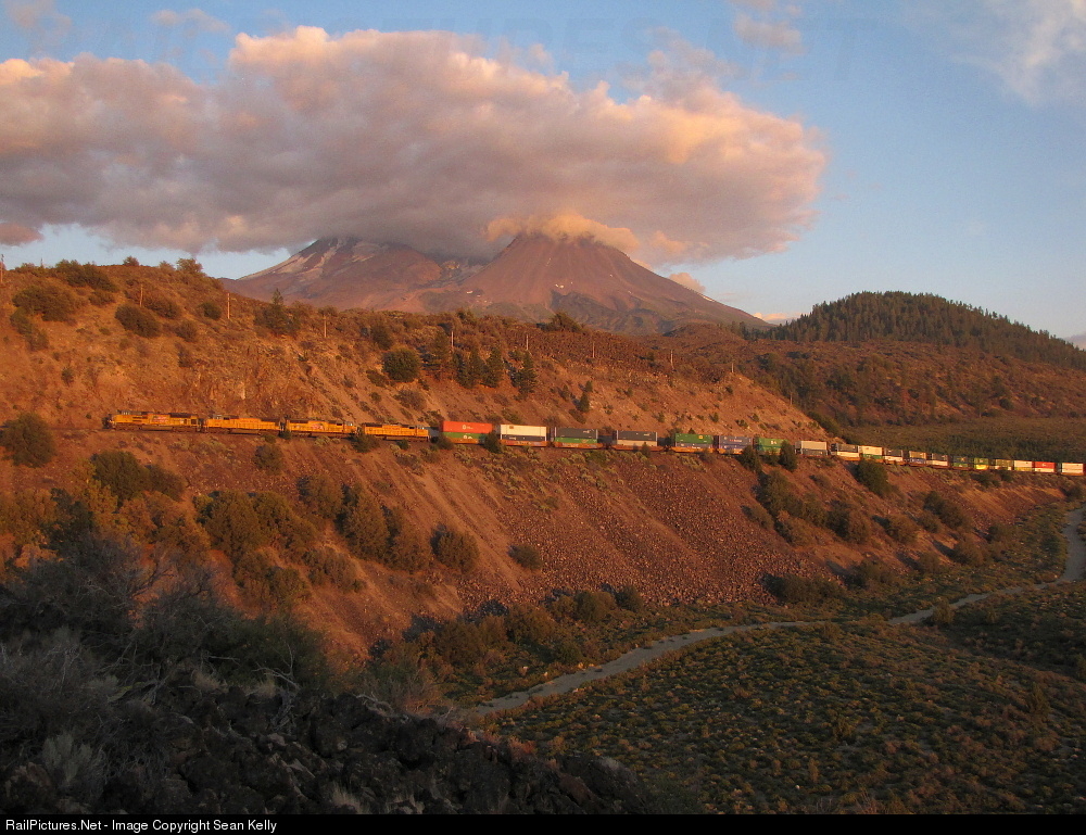 Perfect timing: Five minutes before sunset, I watched with dismay as the sun dropped into a layer of clouds hanging along the horizon to the northwest. I had been hearing the sound of an approaching northbound climbing the grade from Black Butte for the past 15 to 20 minutes, and it looked like it would show just a few minutes too late. But as the train rounded the distant curve ridge out of Hotlum, my friend drew my attention toward the sun again, and I saw that there was a tiny sliver of clear sky right on the horizon that the sun was about to drop into. Just before the train entered the frame, the sun broke into the clear, allowing me to photograph the northbound all-EMD-powered intermodal beneath a cloud-covered Mount Shasta. Less than 30 seconds later, the sun had set.
