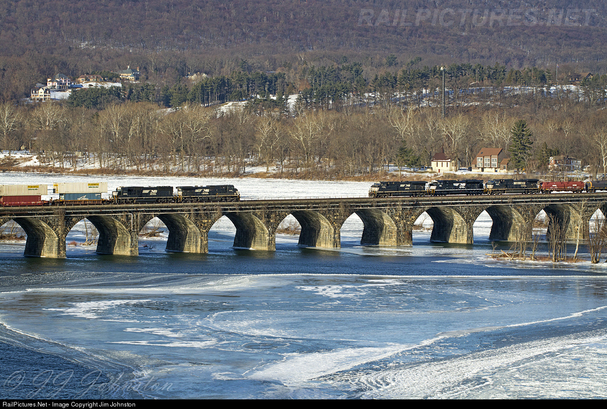 East meets West as the NS 20W intermodal with the NS 9197 and 2555 meets the NS M1V with the NS 7592, 1134 and 9330 midspan over an icy Susquehanna River.