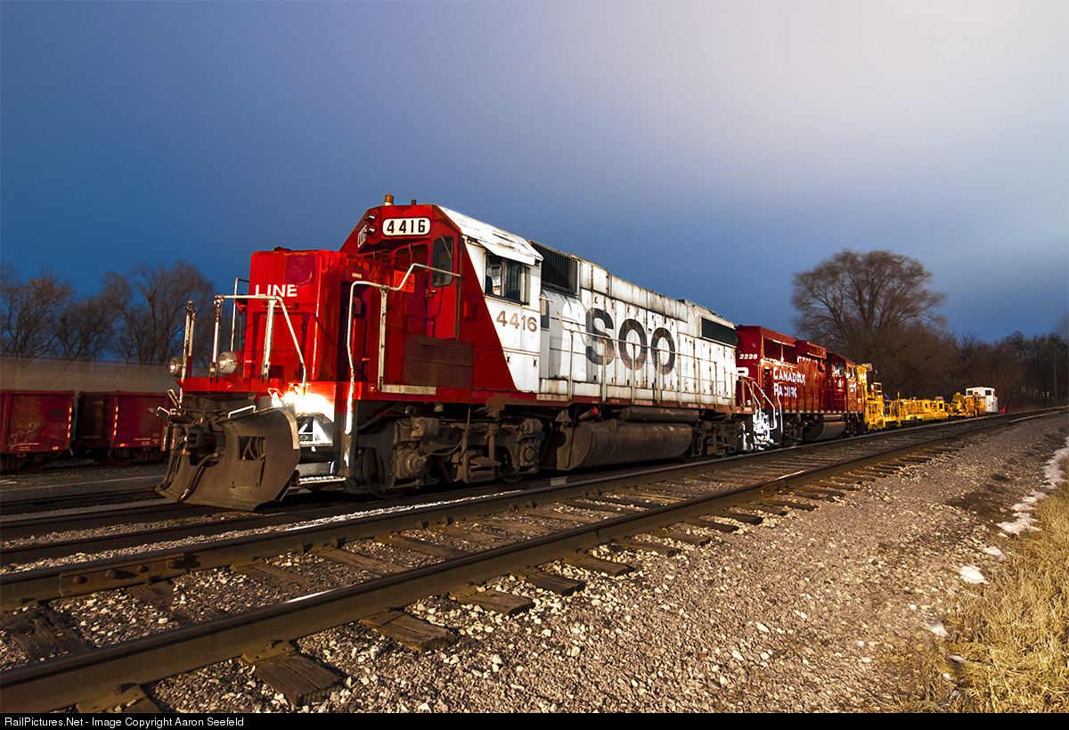 | Soo 4416 and CP 2228 are parked in the Hastings rail yard for the weekend. They will be taking MOW equipment to its next destination in the near future. This picture was taken just after midnight, but a nearly full moon renders the sky a striking blue.