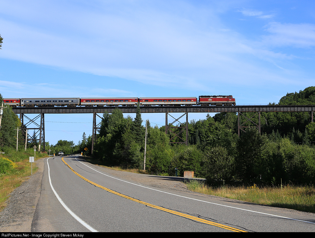 The Canyon train rolls northbound out of the greater Sault St. Marie area on a cool August morning as it heads high above Bellevue Valley.