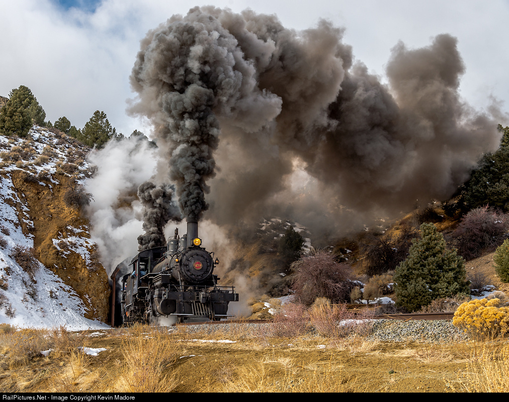 The "Yellow Jacket Tunnel" pictured here was the 4th of 5 tunnels on the line from Carson City to Virginia City, and there were two more tunnels in Virginia City itself. Alas, only two of the original 7 tunnels are still operational. This one is 465 ft long and is located above Gold Hill Depot. The grade here is 2.1%....but you could probably tell that from the vertical exhaust plume. These locomotives are working pretty hard and not going very fast. On the original V&T, this tunnel was lined with wooden timbers....and of course, most of the original V&T engines were WOOD-BURNERS. Yeah, they burned up the tunnel timbers at least a couple of times back in the day. When this tunnel was reopened for the new V&T in 1987, all of the internal bracing was done with welded steel. They no longer worry about fires on this line, but the exhaust fumes can still get a little intense in there as the train struggles up the hill to VC.