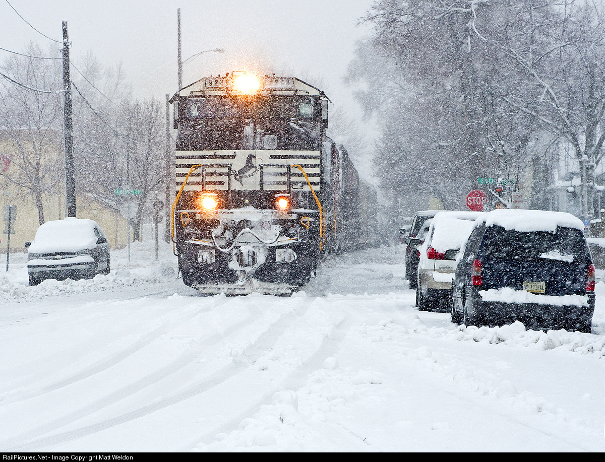 During the height of winter storm "Linus," southbound NS 19K leads a mixed freight train down the middle of Hickory Street in Warsaw, Indiana.
