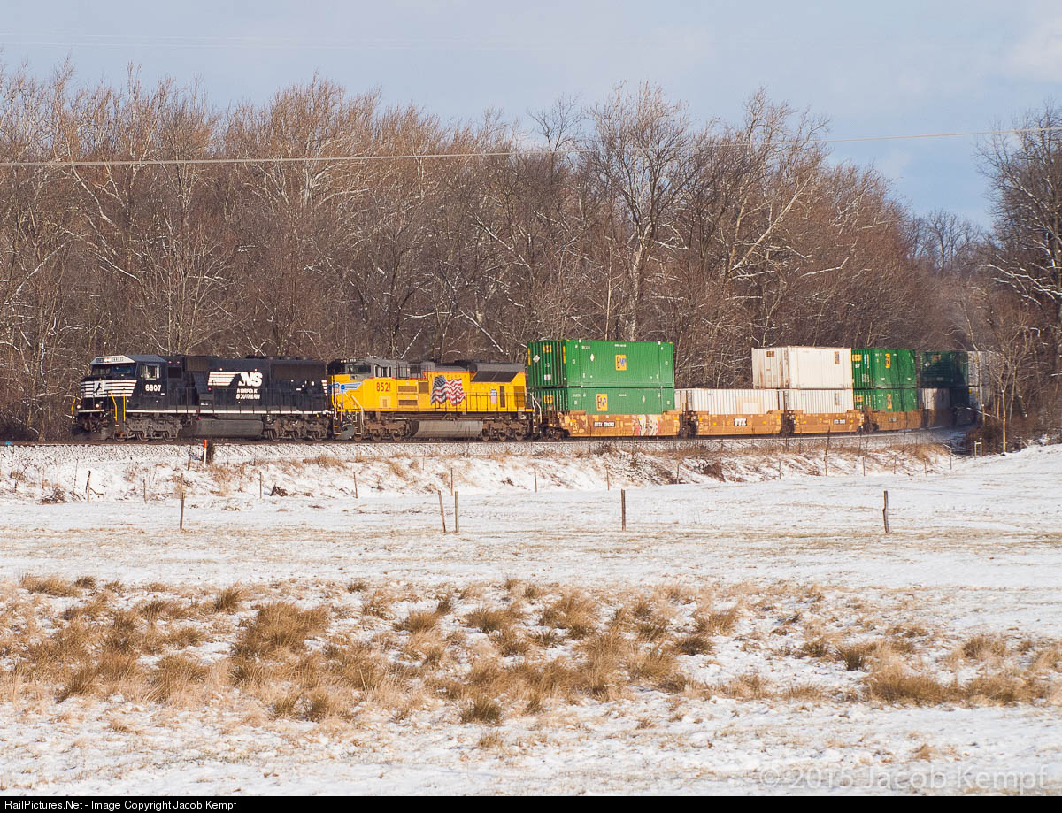 NS and UP EMDs lead hotshot stack train 211 through the farm fields outside Boiling Springs on a bitterly cold and windy winter morning.
