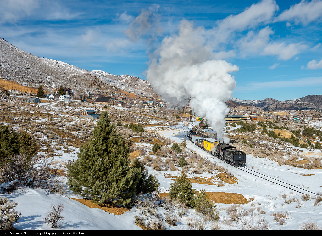 The "V" in V&T. A southbound V&T Freight departs the little city on the hill that puts the "V" in V&T. This is the legendary Virginia City, once known as the "Richest Place on Earth" because it was ground zero for gold mining operations in Nevada's famous Comstock Lode. This place made a lot of millionaires and was the primary reason for the existence of the Virginia & Truckee Railway. Ore was mined and processed here and the V&T was how the product made it to market. Not only was this place an industrial center, but a lot of other businesses thrived here as well, including the kinds of places where miners liked to hang out, like saloons and brothels. When the mining business declined in the late 1800s and early 1900s, so did Virginia City. Fortunately, the place lives on as a tourist destination and National Historic Landmark. Many historic buildings and mining structures remain, and there is a lot to see here. Although the railroad left town in 1938, and the rails were lifted, it returned just 35 years later, when Bob Gray made it his passion to restore the V&T. With recent help from the State of Nevada, a significant portion of the V&T Virginia City Branch has been restored, and now operates as a tourist line. The railroad is headquartered on the very site of the old Virginia City Round House, where you see the string of yellow coaches, just to the right of the locomotive plume. Excursions operate out of the original, 1870-vintage V&T Depot, which is located on F-Street, about a block from the center of town.