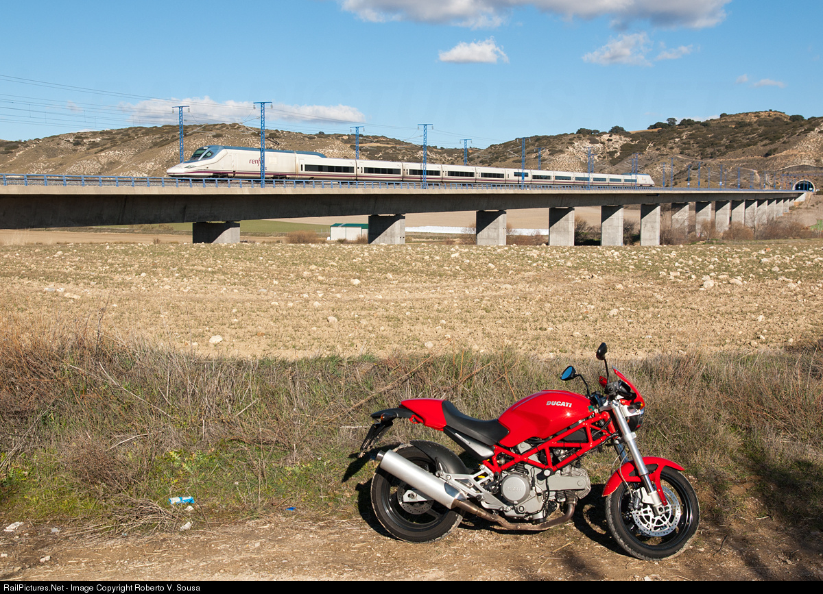 Italian Ducati moto side by side with a spanish train. It was the AVE train number 03141, doing a service from Madrid Puerta de Atocha to Barcelona Sants, here passing a few km´s from the initial station, in Anchuelo bridge. Moto Italiana Ducati lado a lado con un tren español. Era el tren AVE número 03141, que estaba haciendo el servicio desde Madrid Puerta de Atocha hacia Barcelona Sants, aqui pasando algunos km´s después de la estación de partida, en el puente del pequeño pueblo de Anchuelo.