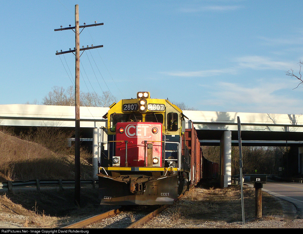 The sunset light of a winter Ohio Valley afternoon glints off the nose of Cincinnati East Terminal Railway GP49 #2807 as it leads train CCET01-03 westbound on the old N&W Peavine in Milford, passing under Cincinnati's circle freeway, I-275. The mailbox and crossing marker are for a small driveway to a private residence on the left side of the tracks down past the highway.