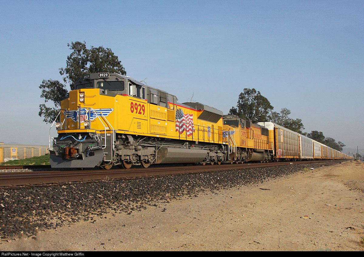 Brand new UP 8929 leads this westbound auto train as it nears its destination at Mira Loma.