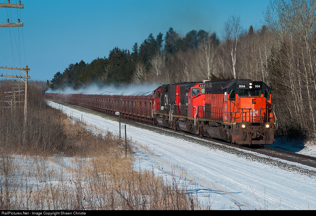| One of the good things about cold temps is that it generaly brings the blue skies and steaming pellets. Here is a good example with BLE 904 leading a loaded taconite train from United Taconite down the CN Missabe sub to Proctor. |