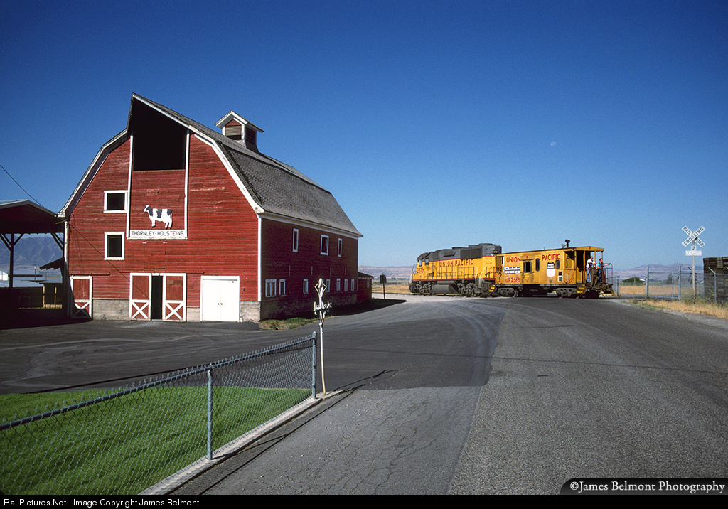 UP's Cache Valley Local glides along the old Del Monte spur to retrieve box cars loaded with steel cans in Smithfield, Utah. In the lead is a former MKT GP39-2 passing local farmer Don Thornley's classic barn on August 25, 1994.