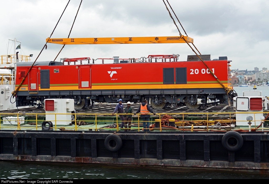 On the morning of the 18th December 2013, amid obvious miserable / less than desirable weather conditions in Durban, South Africa, a rather significant railway event played out at O Shed in Durban Harbour, as the class leader of the new Class 20E (Chinese built), 20 001, was set down on South African soil by the floating crane "Indlovu", having just arrived by ship. Fellow South African and RailPictures.Net contributor, Col. André Kritzinger, has done the most amazing work on Wikipedia (the free online encylopedia), in respect of a series of articles, where he covers the full technical and introductory details of each and every locomotive Class / Type / Series to have worked in South Africa and I quote from his insertion on the Class 20E. "The first ten of ninety-five 3 kV DC and 25 kV AC dual voltage Class 20E electric locomotives for Transnet Freight Rail were built in China by Zhuzhou Electric Locomotive Co., a subsidiary of the China South Locomotive and Rolling Stock Corporation (CSR), China's leading train manufacturer. The first two of these locomotives, no. 20-002 and 20-003, were landed at Durban Harbour on 14 November 2013. Three more, no. 20-001, 20-004 and 20-005 were landed on 18 December 2013. The contract marked Zhuzhou’s largest single foreign order of electric locomotives to date and made provision for the company to export electric locomotive manufacturing technologies to South Africa to enable a local production ratio of more than 60 percent. The roll-out ceremony of the first locomotive, no. 20-001, took place at the factory in Changsha in central China's Hunan Province on 20 August 2013. The remaining eighty-five locomotives are to be built in South Africa by a consortium composed of CSR Zhuzhou and the South African Black Economic Empowerment company Matsetse Basadi. The Class 20E has regenerative braking, a maximum speed of 100km/h, and is equipped with low-speed controls. The units, with radio frequency distributed power (RFDP) technology, will be able to work mid-train in lengthy wagon consists. Following testing, the ten Chinese-built lococomotives are expected to enter service in March 2014. The Class 20E is destined for the ore line between Sishen and Port Elizabeth.”
