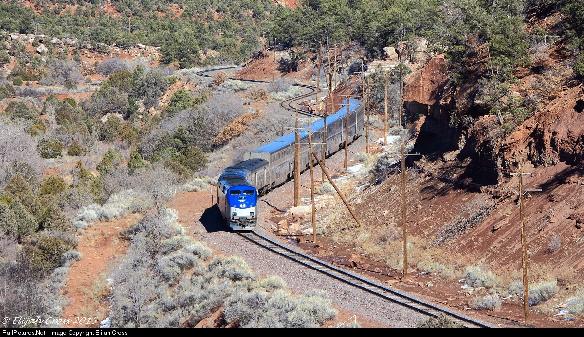 February 7, 2015. On an absolutely beautiful mid winter afternoon, Amtrak's westbound Southwest Chief #3 negotiates the twists and turns of scenic Glorieta Pass.