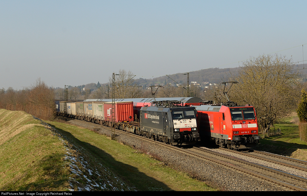 Lucky shot - 146 116 with a northbound passenger train meets black ES 64 F4 - 082 with a southbound intermodal near Kollmarsreute (Freiburg area).