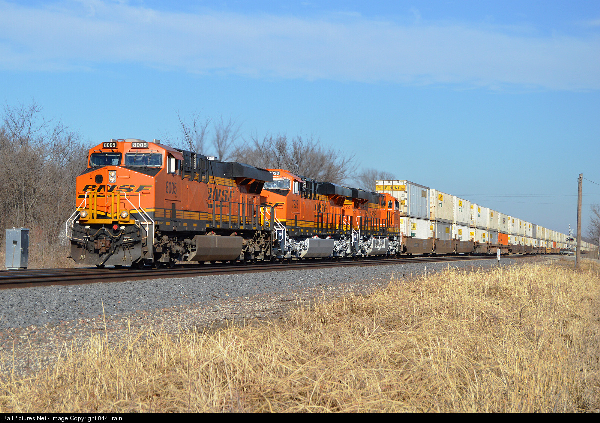 | Cruising at track speed with 3 ES44C4's on the point of a westbound stack train, BNSF 8005 west. The 2nd and 3rd units are numerically ordered 7923 and 7922. |
