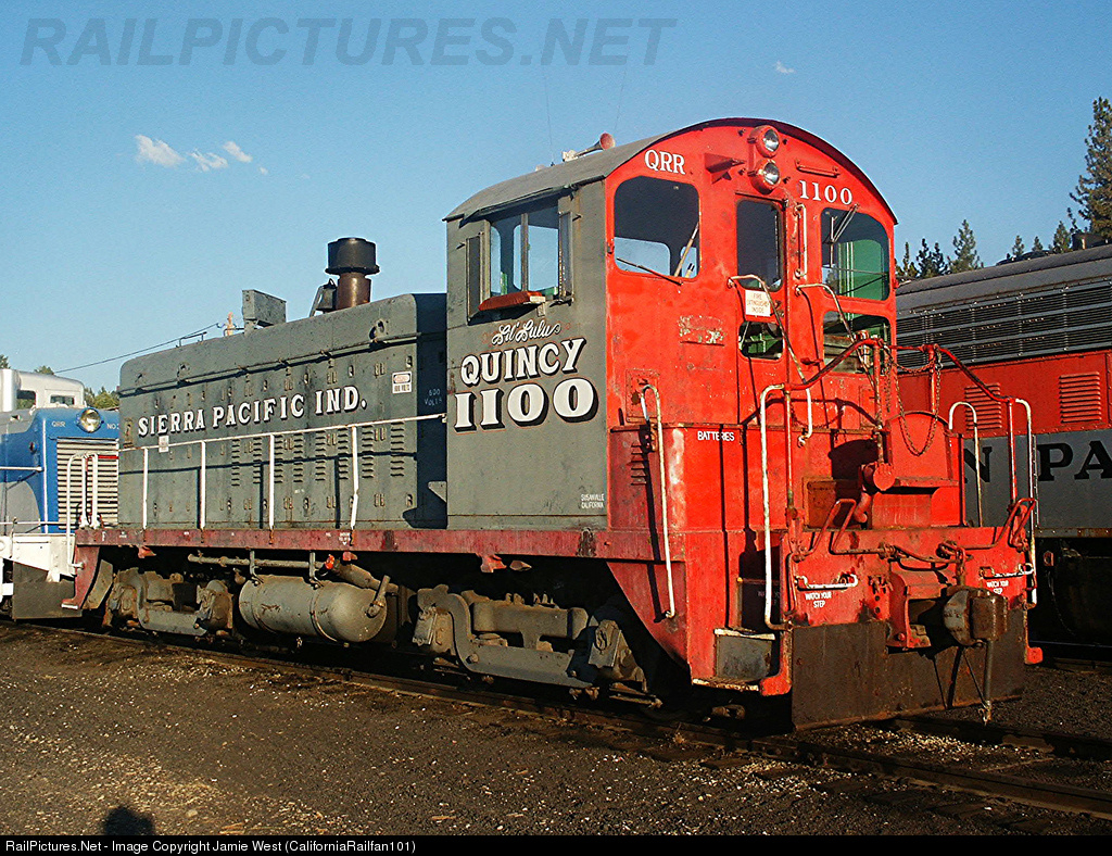| Quincy Railroad 1100, Sierra Pacific Industries "Lil' Lulu", sits on display at the Western Pacific Railroad Museum in Portola, CA during the 2011 Portola Railroad Days. The unit is an ex-EMDX Demonstrator and sports SP's Scarlet and Grey paint scheme. |