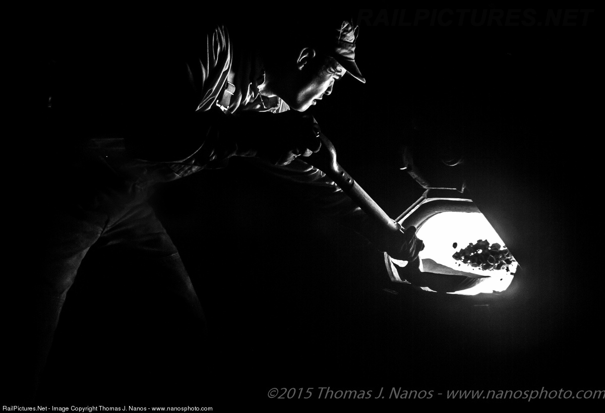 | Valley Railroad fireman Mike Ozaruk shovels coal into No. 3025's firebox as the locomotive pulls a sold out North Pole Express north through Chester, Connecticut. Taken with an infrared modified Canon 30D - illumination provided by the firebox. |