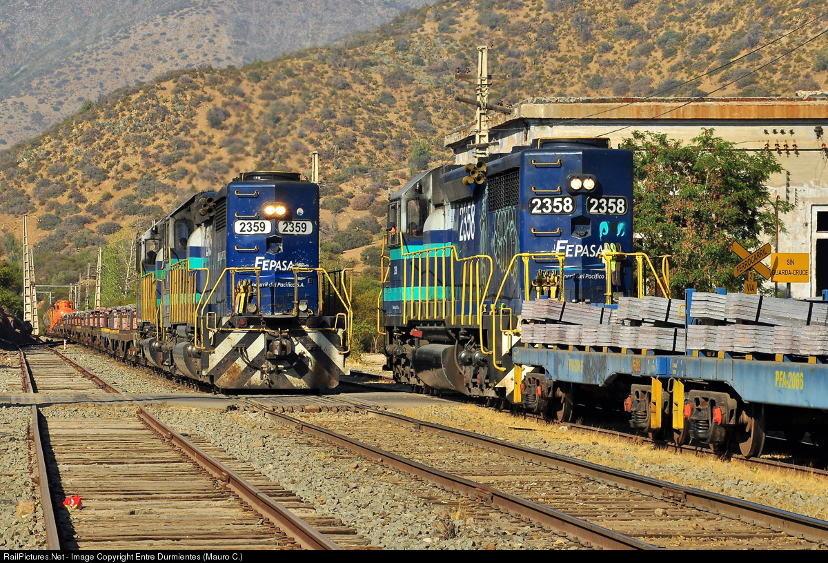 | Copper trains crossing!. In Rungue town, meeting between copper trains: FEPASA #50.990 from Los Lirios (copper from the CODELCO "El Teniente" mine and sulfuric acid to Anglo American Chagres copper foundry) with destination Ventanas seaport, and FEPASA #50.991 from Chagres (copper from Anglo American "Los Bronces - Chagres" mine) and Valparaiso (empty copper cars), to Alameda yard in Santiago, and then to Barrancas seaport in San Antonio. |