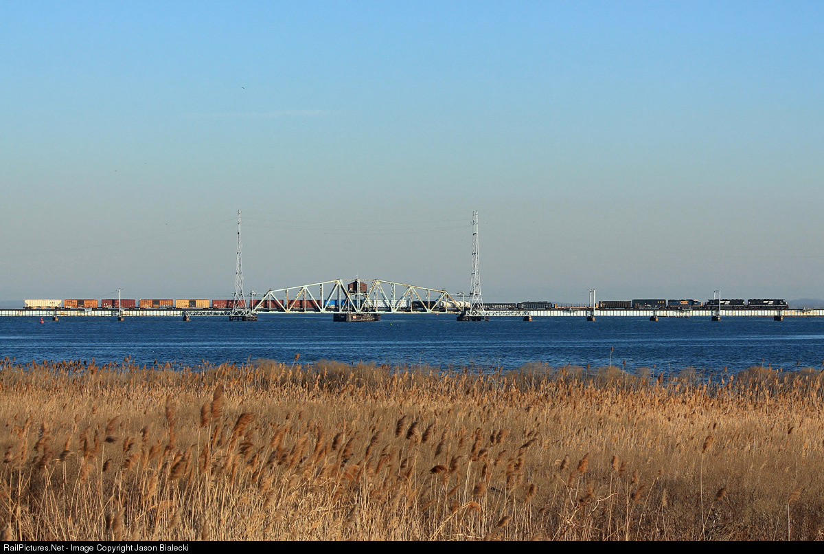 | Freight Train over the Raritan - The entire length of a CSAO transfer train from Oak Island to Browns Yard is seen crossing though the central span of the Raritan River Drawbridge. For the last year this train has consistently been lead by a pair of NS SD45-2s, so catching a CSX geep in tow was a nice treat. |